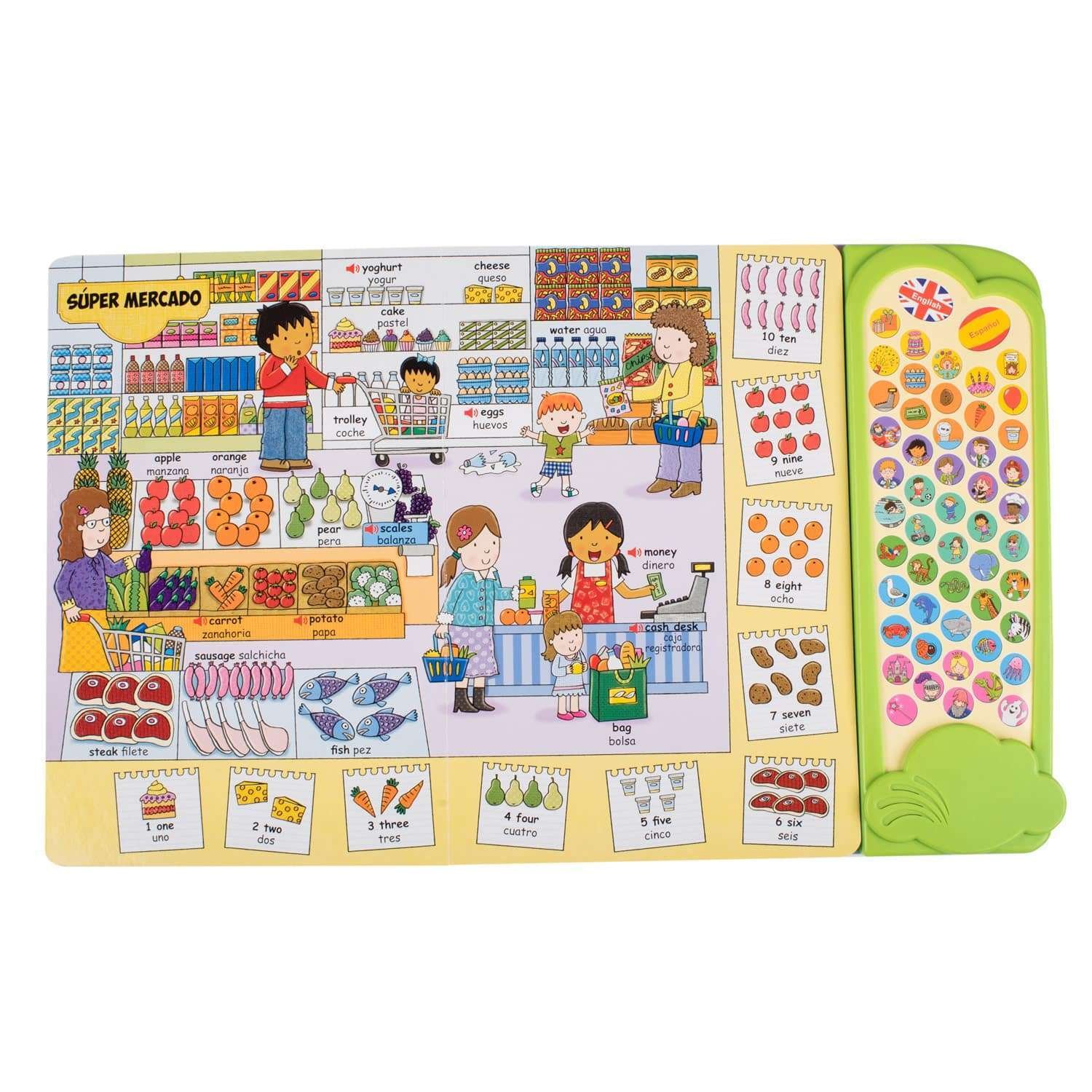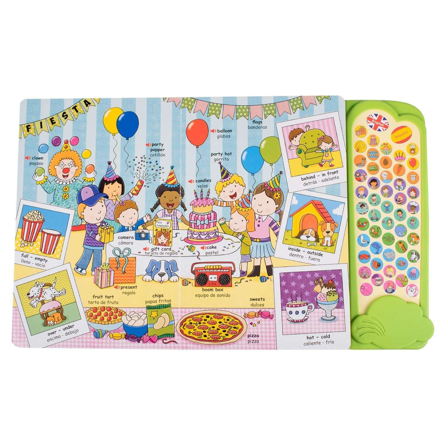 Un libro con divertidos sonidos, para los más pequeños de la casa. Aprenderás nuevas palabras en dos idiomas, sobre temas como: la familia, el hogar, juguetes, comida, juegos infantiles, granja y la ciudad, etc.