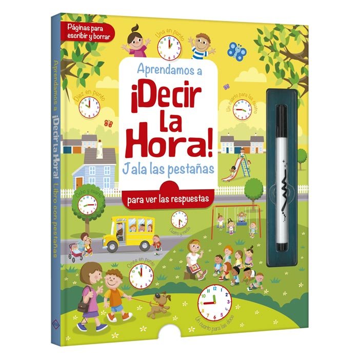 Utiliza el marcador borrable para escribir la hora, luego jala la pestaña y comprueba si lo hiciste bien. Fomenta el aprendizaje temprano en niños desde los 5 años en adelante.