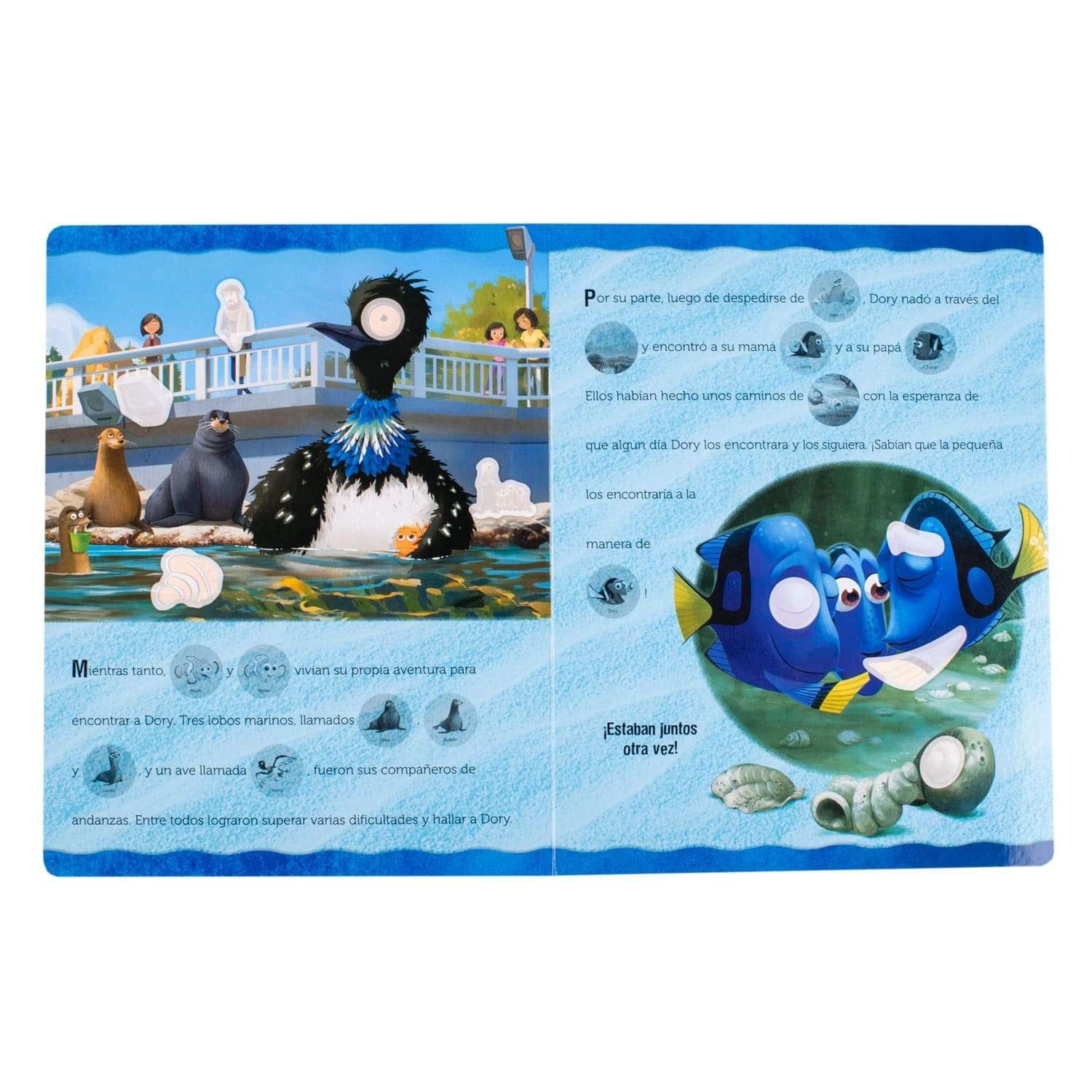 Acompaña a Dory en un viaje inolvidable que la reunirá con sus papás y con nuevos amigos. Utiliza las calcomanías para completar esta historia y diviértete decorando el tablero de actividades.