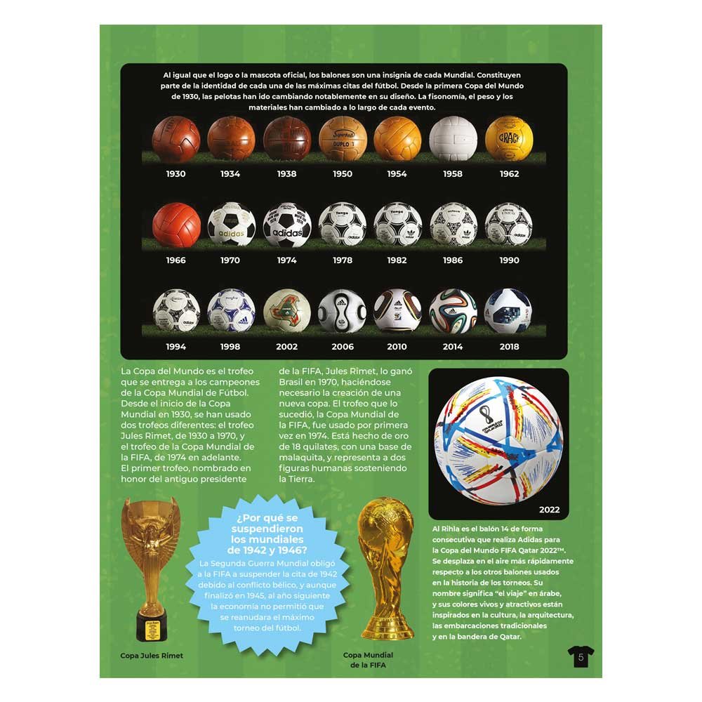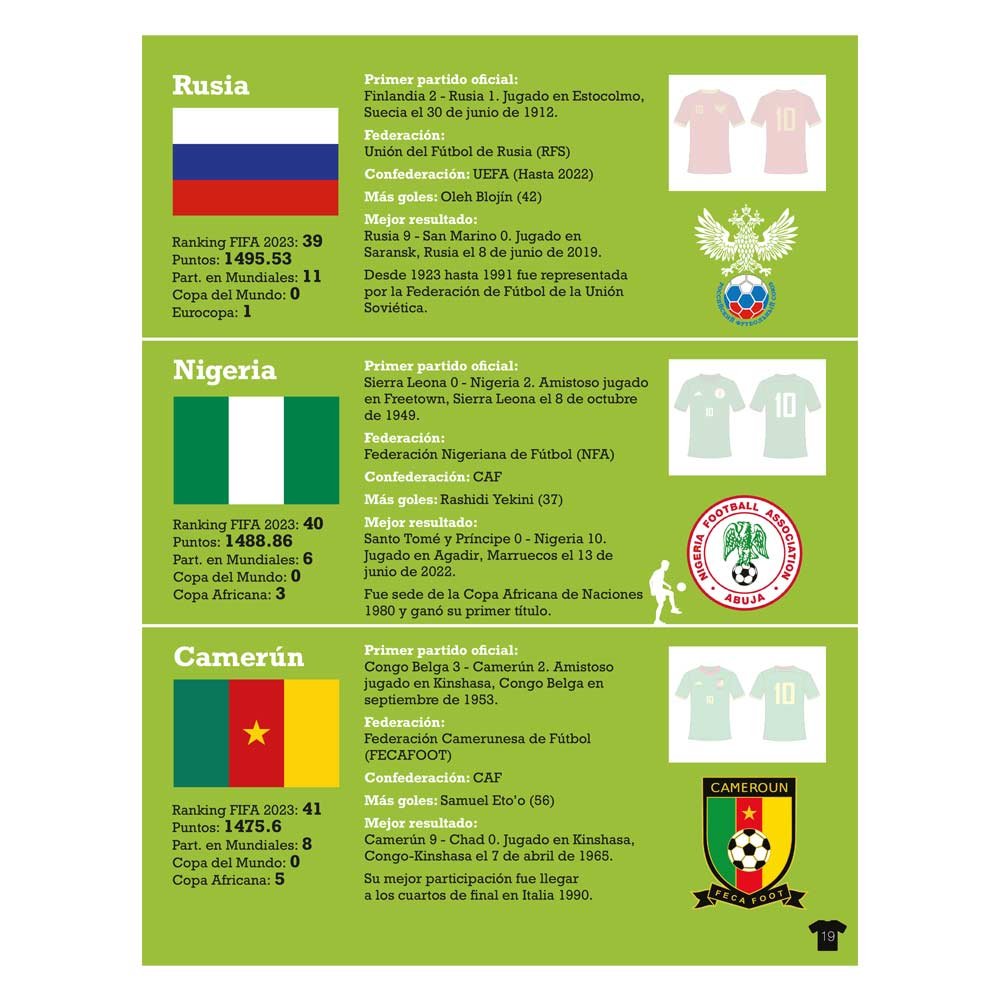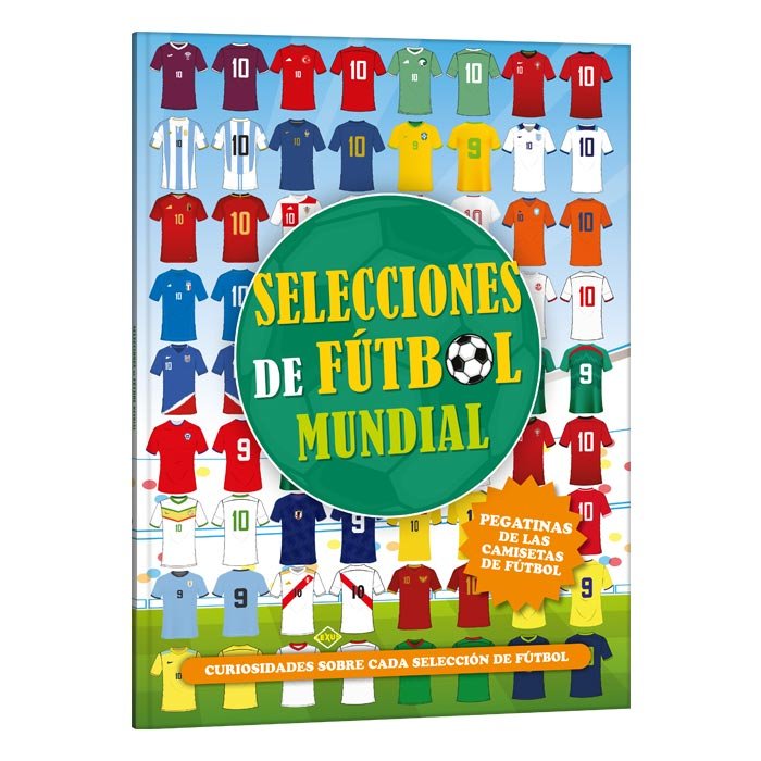 Libro sobre selecciones y mundiales de fútbol, con datos, resultados y goleadores históricos. Incluye banderas, estadísticas y pegatinas de equipos.